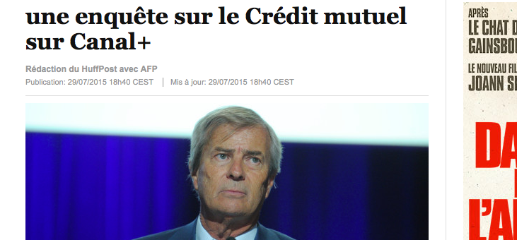 Dans un article publié mercredi 29 juillet, le Huffington Post cite un article de Médiapart (payant) qui révèle que Vincent Bolloré, patron de Vivendi, aurait fait censurer d’un coup de fil une enquête sur le Crédit mutuel, « banque dont il est proche, qui devait être diffusée en mai sur Canal+, filiale de Vivendi ». L’article explique encore :