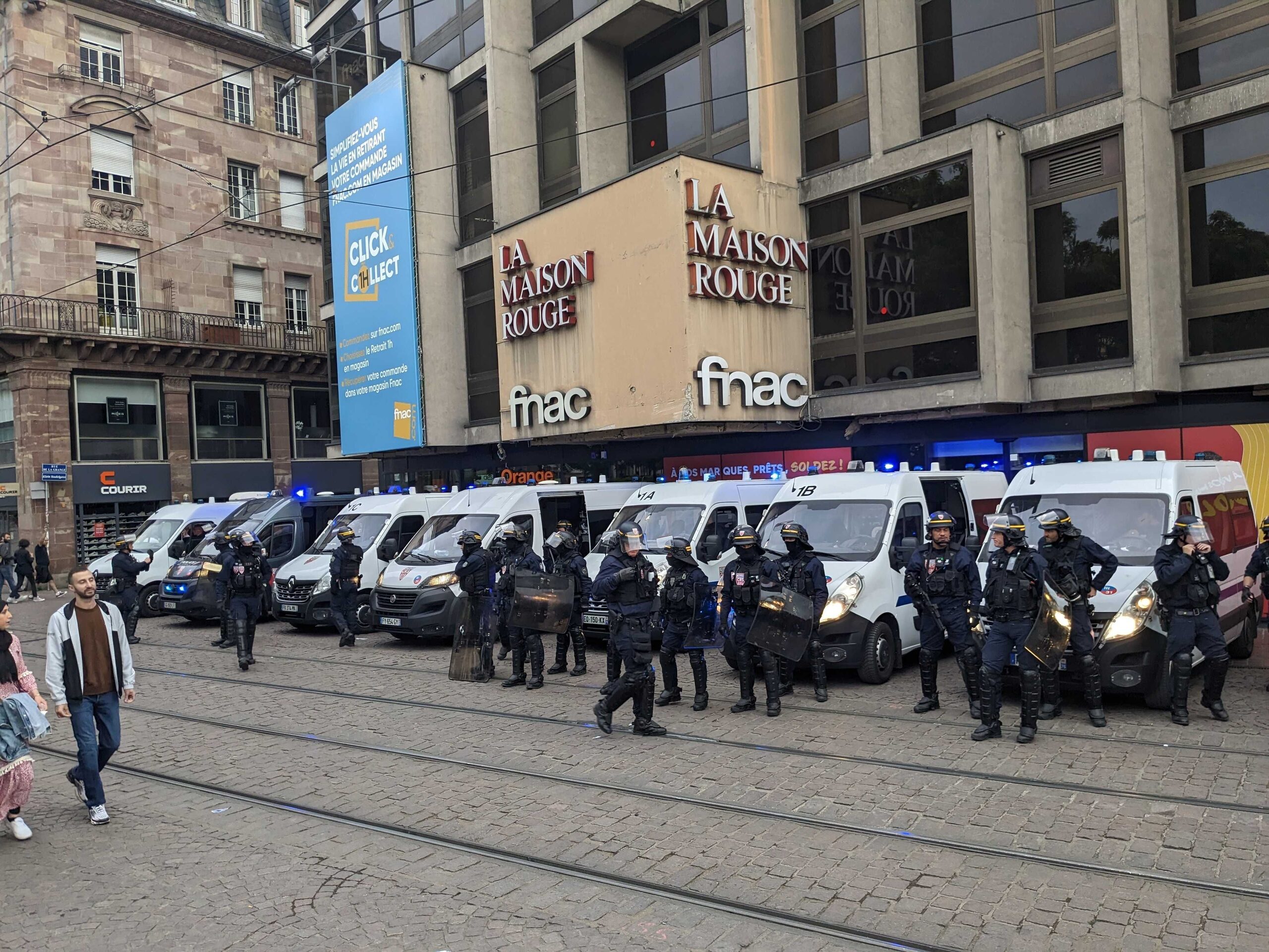 Un important déploiement de forces de l’ordre attend de pied ferme les personnes qui répondraient à l’appel au rassemblement place Kléber.