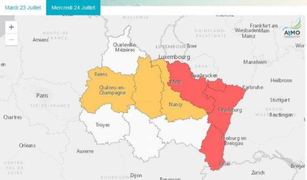 La chaleur et le fort ensoleillement ont fait grimper les niveaux d’ozone (O3) en Alsace et dans l’agglomération de Strasbourg. D’après les prévisions d’Atmo Grand Est, le seuil d’alerte à la pollution atmosphérique en Alsace a continue d’être dépassé ce vendredi 26 juillet. Les autorités maintiennent donc le plan d’action (vitesse réduite hors-agglomération, tarif des transports en commun réduits et circulation différenciée à Strasbourg) afin de limiter au maximum la pollution de l’air.