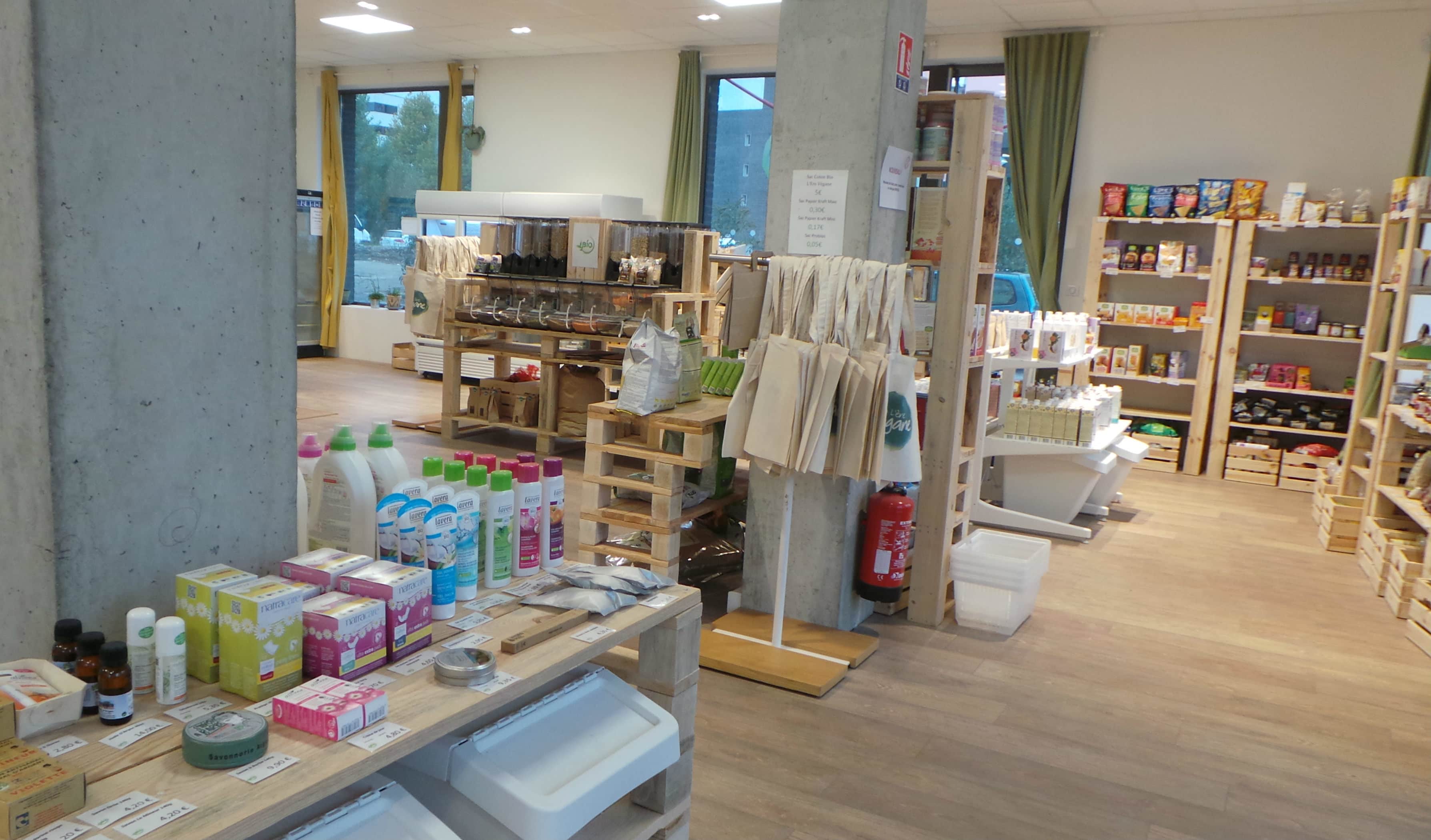 À midi, les clients peuvent déguster un plat du jour autour d’une grande table. Et bientôt, le magasin proposera même des vêtements garantis végans. Les animaux sont admis dans la boutique, les enfants ont leur espace de jeux, tout y est recyclé, les emballages sont compostables.