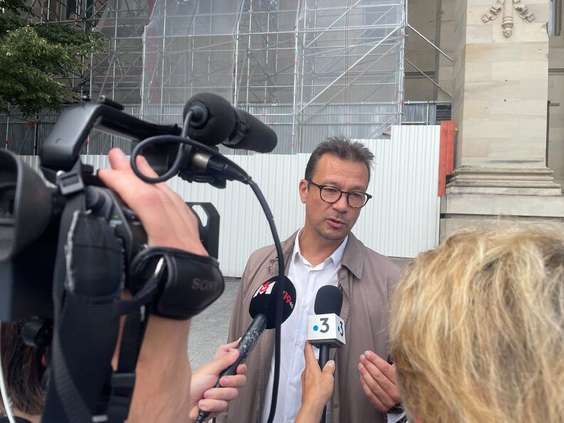 Maître Grégory Thuan Dit Dieudonné, avocat de l’association Innocence en danger, devant le tribunal judiciaire de Strasbourg le 23 juillet 2025.Photo : Camille Balzinger / Rue89 Strasbourg