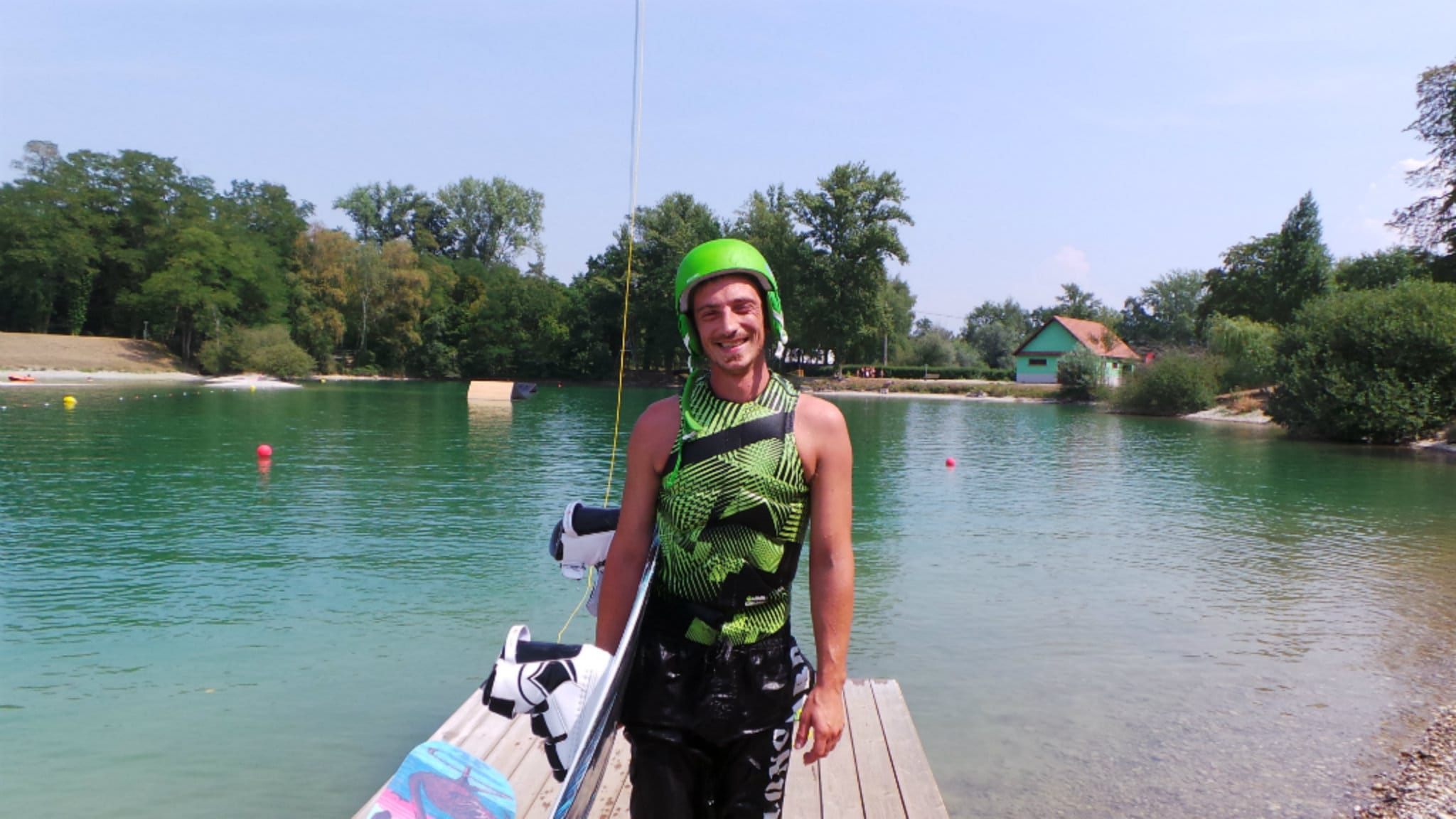 « C’est ce qui nous manquait en Alsace. Je suis un gros amateur de sport à sensations fortes, vélo, skate, wakeskate etc., mais on n’avait pas grand-chose sur l’eau. Alors quand j’ai entendu parlé d’un nouveau wakepark, par le bouche-à-oreille, je suis venu voir tout simplement, j’en fait depuis quatre ans un peu partout. J’ai commencé par le wake skate, derrière une écluse, sur place, avec des jet ski sur le Rhin, dans un club du coté de Colmar aussi et j’ai même été tracté par une voiture, on peut dire que j’ai tout essayé. Ici ce qui est bien, c’est que tu évolues très rapidement avec de bons conseils et que les modules sont vraiment cools. En plus, l’ambiance est sympa et personne ne se la pète, il n’y a pas de m’as-tu-vu. À Brumath, apparemment ils viennent d’installer des modules aussi, donc je vais aller faire un tour. Parce que j’avoue que sans modules, on s’ennuie assez vite au bout d’un moment, c’est moins sympa. »