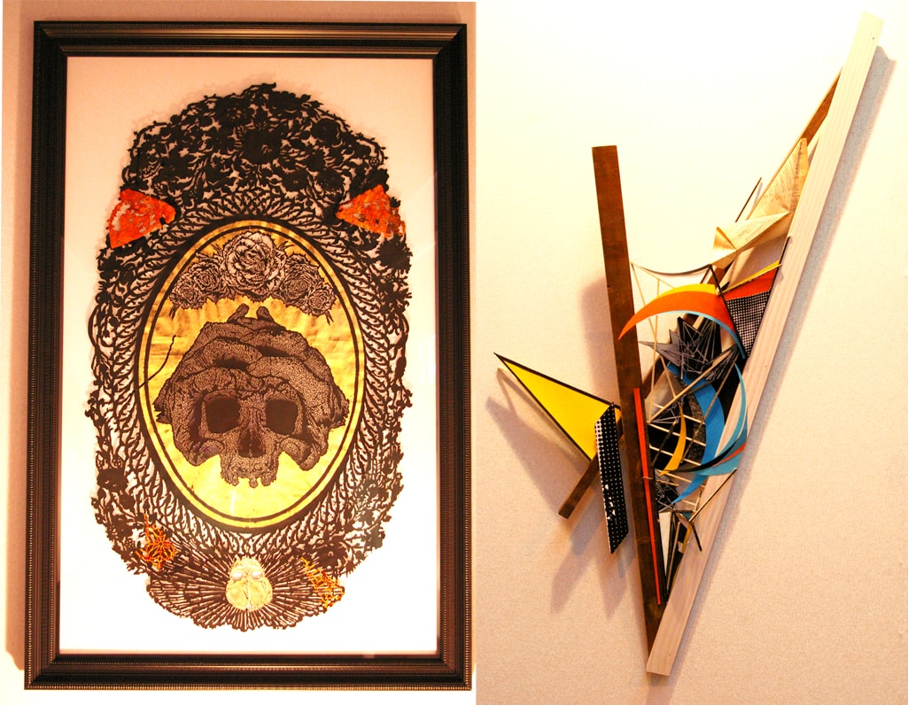 L’œil frais, le cerveau disponible, j’accorde une pleine attention aux premières galeries. Collection si Particulière, basée à Épinal, propose des œuvres de graffeurs reconvertis : ça me parle. Rubbish est entré dans le monde du marché de l’art grâce à ses pochoirs, ou plutôt à leurs matrices. Sa technique s’est affinée jusqu’à ces papercuts sophistiqués, de véritables dentelles nécessitant des centaines d’heures de travail. À ses côtés, les assemblages de Gilbert 1 tiennent à la fois du graff, du nouveau réalisme, du futurisme… Bah oui, c’est du « graffuturism », m’apprend le galeriste.