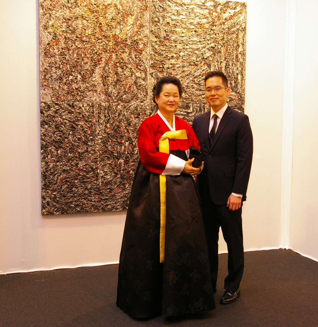 Devant une autre cellule blanche, une affichette m’interpelle : « Les œuvres ne sont pas à vendre ». Tiens ? La peintre coréenne Hwang Eun Sung en habit d’apparat m’explique, secondée par son fils :
