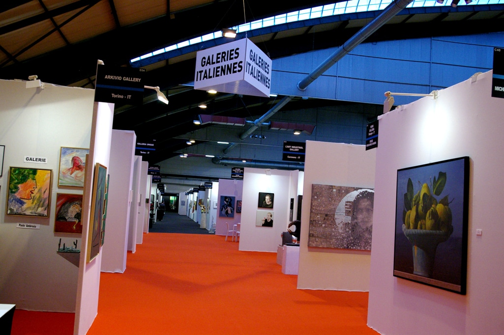 Je continue mon chemin jusqu’à une rupture dans l’espace d’exposition : un immense écriteau indique les « Galeries Italiennes », regroupées sur un îlot éclatant de moquette orange. Je rencontre fort à propos Mme Paola Forni, qui m’éclaire sur cette mise en valeur particulière :