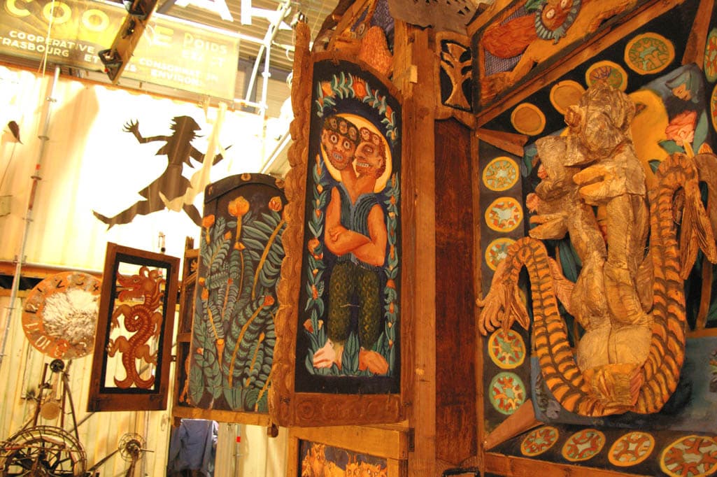 Dans un coin, un vacarme reconnaissable m’attire : ce sont les artistes du Port du Rhin qui s’affairent à une installation géante, bruyante et foutraque ! On y verra un immense retable païen, des containers superposés avec des mini auto-tamponneuses interactives, un morceau de l’horloge qui sera installée à la cathédrale en 2015. Daniel Depoutot et Valentin Malartre racontent comment ils en sont venus à participer à St’art :