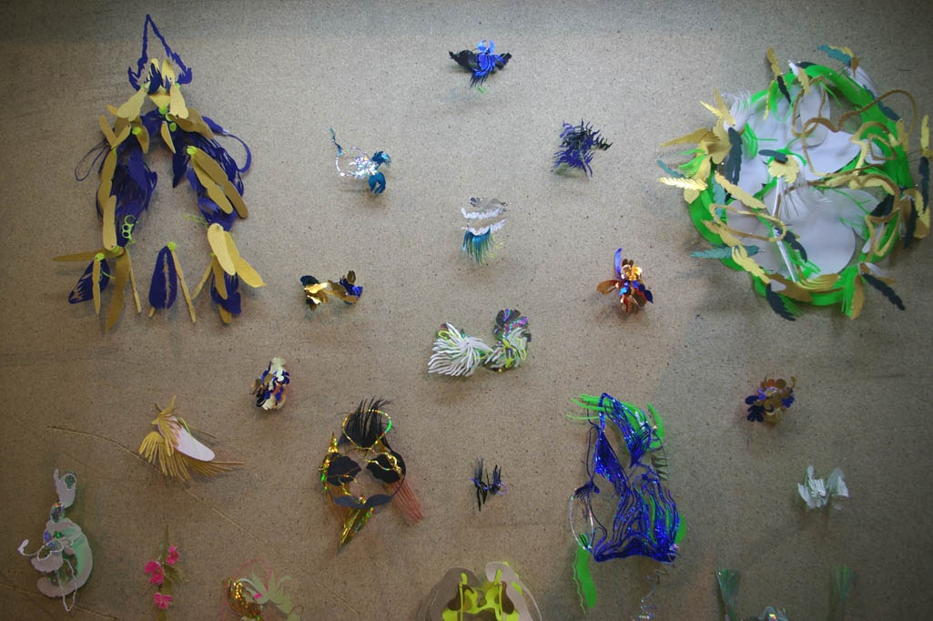 Vers le fond, des stands qui ne sont pas des galeries mettent à l’honneur de jeunes artistes. Dans Carte Blanche à la Ville de Strasbourg, quatorze sortants de la HEAR présentent des Objets Hybrides. Estelle Henriot a imprimé en longues bandes des forums de discussion sur le thème « qu’est-ce que l’art ? »… mais n’a pas trouvé de réponse ferme. Laetitia Oser a réalisé de délicieux petits assemblages en papier multicolore, à la fois bijoux, insectes et jouets. La scénographie du stand a été confiée à Pétrole Editions : Marianne Mispelaëre, l’une des quatre membres, explique la démarche :