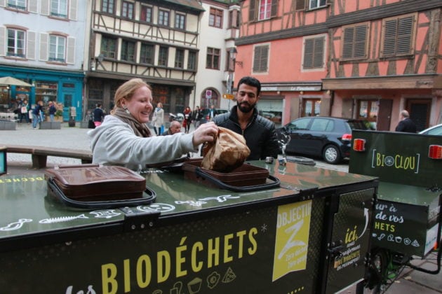 Alors que son usine d’incinération n’en finit plus d’enchaîner les déconvenues, Strasbourg cherche des solutions pour réduire le poids de la « poubelle bleue ». Le ramassage à vélo n’est qu’une seule tentative parmi l’éventail de solutions testées par l’Eurométropole. On connaissait déjà le compostage de proximité par les associations et la collecte de biodéchets à vélo pour les restaurateurs. Holtzheim vient d’inaugurer la première collecte de biodéchets en « apport volontaire » de l’Eurométropole : les cobayes se sont vus confier le même seau marron que les habitants de la place Saint-Étienne à Strasbourg, qu’ils viendront vider aux points de collecte prévus. Avantage sur le vélo : plus besoin de pointer avec son seau à épluchures à une heure précise, chacun vient déposer ses restes alimentaires quand bon lui semble. Une expérience similaire est prévue à la Montagne Verte avec des conteneurs semi-enterrés, toujours menée par Recybio.