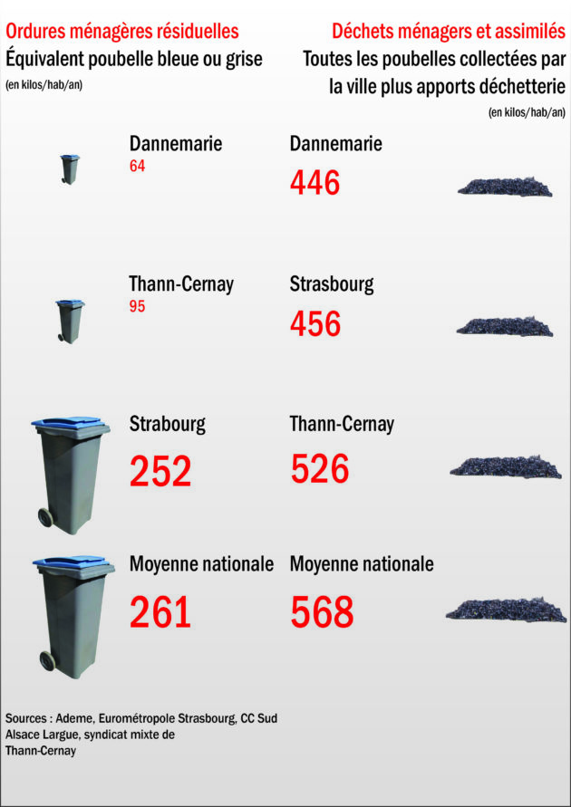 D’ordinaire, les petites agglomérations tendent à produire plus de déchets (toutes poubelles confondues plus apports en déchetterie) que les grandes métropoles. Mais avec ce régime draconien sur le sac poubelle non recyclé, les agglos modèles rivalisent avec les performances des grandes villes : 446 kilos de déchets par habitant pour Dannemarie, 526 kilos pour Thann Cernay, contre 456 kilos pour Strasbourg.
