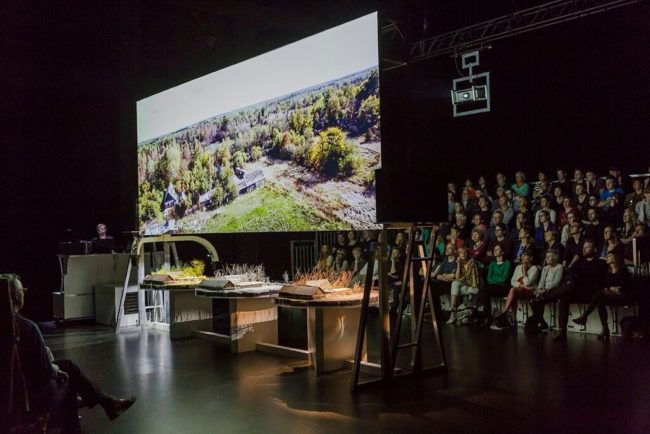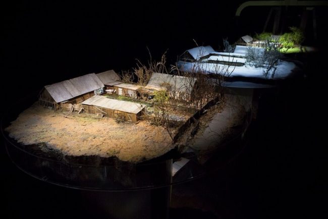 Dans cette création, ce qui n’aurait pu être qu’un documentaire rend compte de la force du spectacle vivant : on donne rendez-vous aux spectateurs pour les plonger dans ce récit si éloigné et pourtant si proche. Le public est divisé en deux groupes, situés de part et d’autre de la scène selon un dispositif bi-frontal, avec, au centre, l’écran. En dessous, sont disposées trois maquettes de la ferme à différentes saisons, animées par des images du documentaire. Ce dispositif permet de compléter le film porté à l’écran :